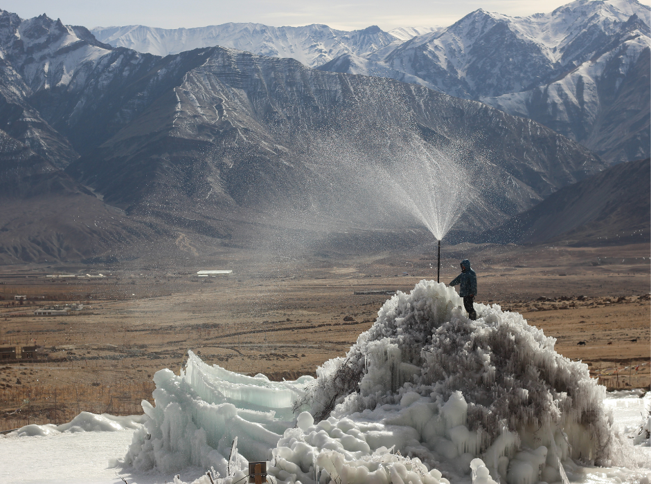 With “Ice Stupa Artificial Ice Reservoir Technology” (AIR), unused water is stored in large ice towers during the winter.
