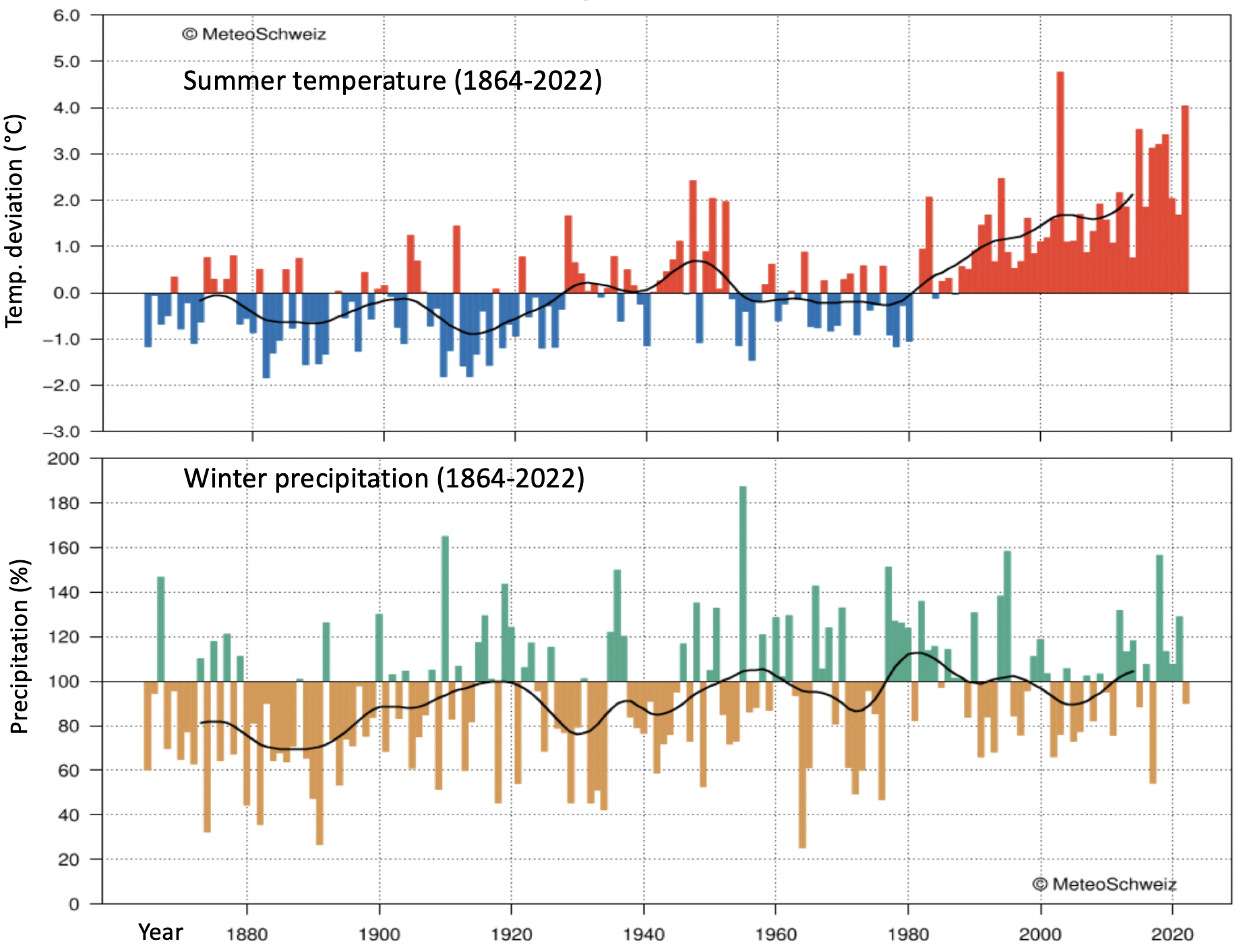 MeteoSchweiz hat die Daten der Schweizer Wetterstationen sehr detailliert ausgewertet und die Reihen homogenisiert (Begert und Frei, 2018). Für mehrere Standorte sind Niederschlags- und Temperaturdaten seit 1864 verfügbar. Auch Karten und Grafiken sind auf der Website von MeteoSchweiz zu finden. Hier besprechen wir zwei Datensätze, die für das Verhalten der Gletscher am relevantesten sind: Sommertemperatur und Winterniederschlag, gemittelt über die Schweiz, bezogen auf das Mittel der Periode 1961-1990. Die schwarzen Linien in den Diagrammen zeigen das Ergebnis der Tiefpassfilterung (20 Jahre).